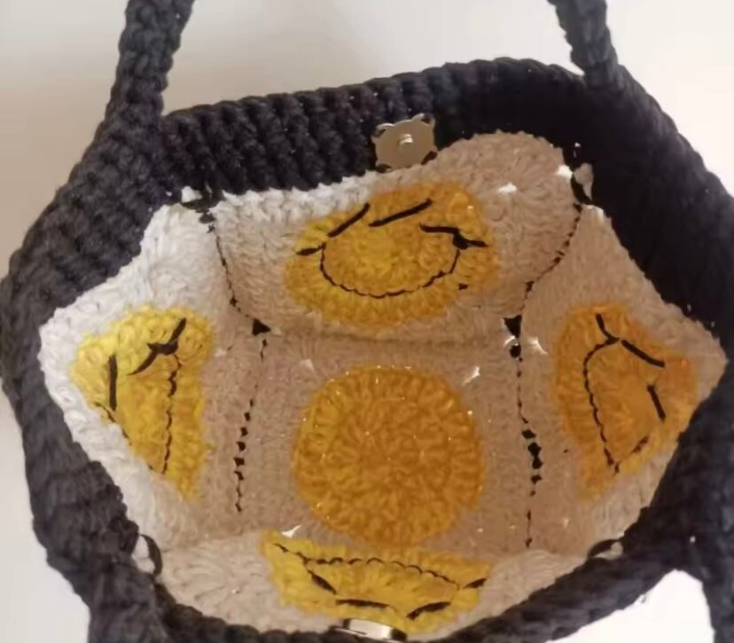このレトロなスマイルバッグは、遊び心満載のデザインで、ビーチやお出かけにぴったりのアイテムです。かぎ針編みの技法を活かしたこのバッグは、おしゃれでありながら手軽に持ち運ぶことができます!